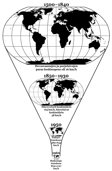 Tasojen suhteinen ymmärtäminen on David Harveyn (1989b: 348; 2000: 75) mukaan aivan keskeistä. Hyvin usein tutkittavia asioita tulee tarkastella kaikilla hierarkkisilla ja limittäisillä tasoilla, ja näiden välisissä suhteissa, jotta ilmiöstä saadaan riittävän tarkka kuva. Esimerkiksi globaalin tason kulttuurituotanto ja -markkinointi ulottuvat ihmisten olohuoneisiin asti. Aina tasojen välinen tarkastelu ei kuitenkaan ole mahdollista. Harvey (2000) näkee, että ihmisten toimintojen orkestrointi eri tasoilla riippuu vahvasti teknologisista innovaatioista ja siitä, kuinka skaalat muuttuvat ajan myötä. Esimerkiksi Baltimore määriteltiin ja skaalattiin hyvin eri tavalla 200 vuotta sitten. Kaiken kaikkiaan Harvey haluaa puhua skaalojen spatiaalisesta tuottamisesta (production of scales), joka tulee liittää hyvin tärkeänä näkökulmana mihin tahansa teoriaan, joka selittää maantieteellistä epätasa-arvoista kehitystä. (Emt.: 76−77.) Lisäksi erityisen oleellista on hahmottaa, että maailma on kutistunut liikenteen innovaatioiden myötä maailmankyläksi; tilan läpikulkuun käytettävä aika on vähentynyt merkittävästi (Kuva 1). Matkustajalentokoneet saattoivat edetä 1960-luvulla jopa 1127 km/h (Harvey 1989b: 240−241), mutta Concorden matkanopeus oli jopa 2200 km/h.