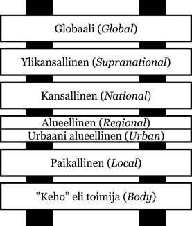 Väitöskirjassani osoitan, että globaali taso kytkeytyy globaalien yritysten tasoon, ylikansallinen taso EU-tasoon, kansallinen taso valtiolliseen tasoon, alueellinen taso valtion aluehallinnon tasoon sekä paikallinen taso kuntatasoon. Suomesta voi löytää esimerkin hallinnollisen skaalatason eliminoinnista. Mainittakoon, että läänitaso on poistettu. Tasoja on myös yritetty lisäillä, esimerkiksi hyvinvointialueita perustamalla.