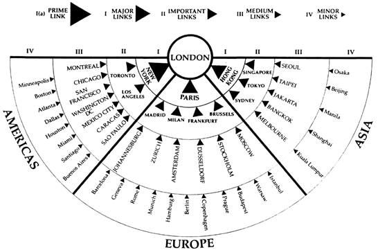 Linkit tarkoittavat yhteyksiä tai reittejä verkostojen sisällä. Jonathan Beaverstock, Peter Taylor ja Richard Smith (1999; 2000) ovat analysoineet Lontoon globaalia ulottuvuutta maailmankaupunkien verkostossa (Kuvio 1). Beaverstock, Smith ja Taylor (2000) tarkastelevat, missä laajuudessa ulkoisia kirjanpito-, mainonta-, laki sekä finanssi- ja pankkipalveluita on tarjolla 54 maailmankaupungissa, kun Lontoosta käsin tehdään kansainvälistä liiketoimintaa. Britannian imperialistinen perintö selittää, miksi Toronton ja Sydneyn firmojen linkit Lontoon maailmankaupunkiin ovat yleisesti vahvoja. Minneapoliksen, Osakan ja Münchenin linkit Lontooseen ovat vähäisiä muihin maailmankaupunkeihin verrattuna. New York, Pariisi ja Hong Kong ovat vahvimpia palveluntarjoajia Lontoolle. Washington DC ja Bryssel erottuvat edukseen esimerkiksi lakipalveluita tarkasteltaessa. Düsseldorf pärjää erinomaisesti kirjapitopalveluissa.