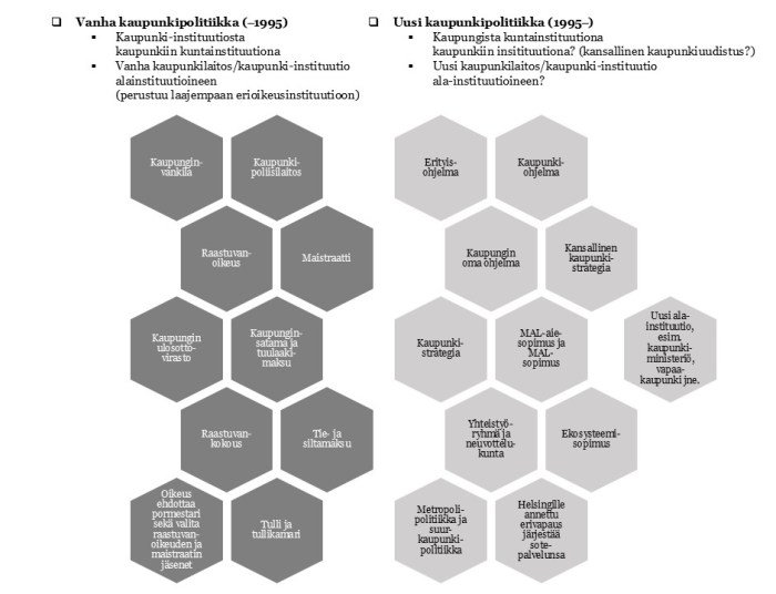 Toimintaympäristössä tapahtuvat muutokset ja kriisit vaikuttavat politiikassa tehtäviin valintoihin, ja siinä käytettäviin tiekarttoihin. Silti suuret institutionaaliset valinnat on voitu lyödä lukkoon jo aikoja sitten, eikä näitä voida kriisitilanteessa muuttaa, esimerkiksi nimetty uusi suomalainen kaupunkipolitiikka jatkui koronaviruskriisistä huolimatta. Vuodesta 2020 ei esimerkiksi ole havaittavissa mitään sellaista radikaalia murtumaa, joka indikoisi ”jonkun ihan uuden” kaupunkipolitiikan synnyn. Kriittinen taitekohta suomalaisen kaupunkipolitiikan historiassa on edelleenkin vuosi 1995, jolloin muun muassa kumottiin kaupungeille vuonna 1789 annettu kuninkaallinen vakuutus, jolla oli ollut jopa perustuslain voima. Vakuutuksen tärkeimmät osat olivat toki menettäneet merkityksensä historian saatossa, esimerkiksi porvarit menettivät erioikeutensa jo 1800-luvun puolivälin jälkeen. Vakuutuksella kuningas oli halunnut suojella porvarien erioikeuksia ”nyt ja iän ikuisina aikoina”; samalla tavoin Kustaa III oli halunnut turvata myös kaupungeille lahjoitetut maat, joita ei saanut luovuttaa ”kenenkä käteen hyvänsä” ja jotka eivät saaneet menettää luontoansa. Laki kaupunkien lahjoitusmaiden luovuttamista koskevien rajoitusten poistamisesta kuitenkin annettiin 1962. Alunperin kaupunkien merenkululle ”ei kukaan saanut vähintäkään estettä tahi haittaa tehdä”, kuitenkin laki kaupunkien kaupankäyntioikeuksista kumottiin 1868, jako tapulikaupunkeihin ja maakaupunkeihin poistettiin 1879, tuulaakin kanto lakkautettiin 1978 ja laki kaupunkien satamanpitoon liittyvien erioikeuksien kumoamisesta astui voimaan vuoden 1995 alussa. Kaupunkilaitos ajettiin siis systemaattisesti ja pitkällä aikajänteellä alas – tämä oli perusteltua, koska olihan kaupunkeja ohjannut vakuutus, ”kaupunkien perustuslaki”, hyvin vanha ja ”out of date” ajatellen yhteiskunnan kehittämistä eri aikoina. Toisin kuin lakkautetuissa henkilöiden privilegioissa (ts. aateliset, papit, porvarit ja talonpojat) kaupunkien erioikeuksissa nähtiin kuitenkin myös mahdollisuuksia, mistä kertoo jo se, että kuninkaallista vakuutusta ei kumottu Suomen itsenäistyttyä.